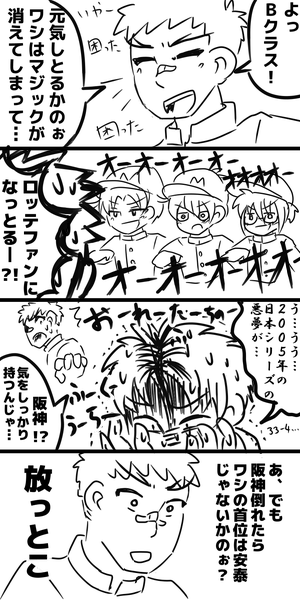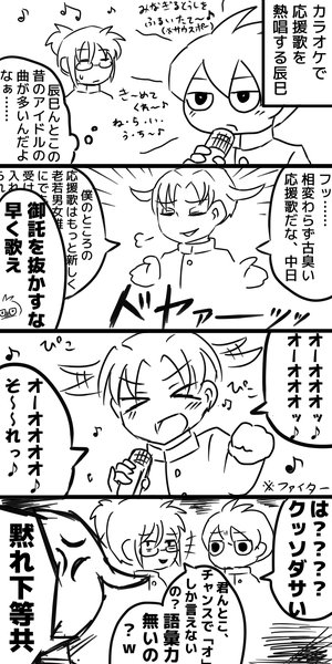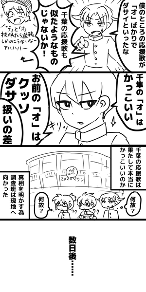 2017/09/01 辰巳・京也・優兎・広志・大河(+千隼) 各球団の応援歌(主にチャンステーマ)ネタ+時事ネタ。 一番カッコよくて洗脳性が高いのはロッテのだと思う。 実は続きのネタがあるのでそのうち描きたい。