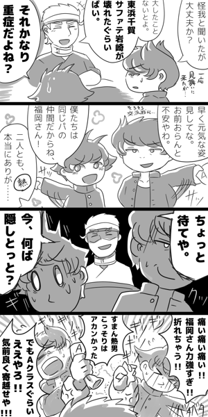2018/05/26 熱男・有志夫・楽人 今年の熱男は怪我(人)だらけと聞いて、交流戦前に兄弟ふたりでお見舞いに…な話。 有志夫のAクラスチャレンジ&五割チャレンジ記念に描いたもの。 しかし当然の如く両方失敗……この、時は。 (※06/13追加)おまけ。
