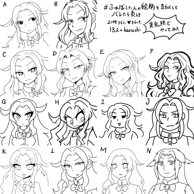 2018/06/12 美兎 Twitterで「#ふぁぼした人の絵柄を真似してバレたら負け」 というタグを使い、反応してくれた人+私の絵柄で 美兎様を描いてみた。 ちなみに正解は A.ヤッスンさん B.すあまさん C.しんしあさん D.みなみさん E.いずやさん F.ベルネキさん G.魔争さん H.メカニカルさん I.ゆびさん J.PJさん K.るささん L.わたし M.星子せあさん N.ウルフさん です!いいねいただいた方ありがとうございました!